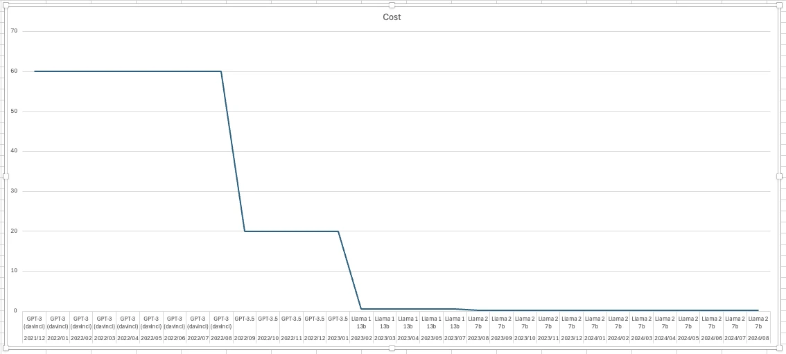 Minimum price per million tokens for an LLM with a 42 MMLU score